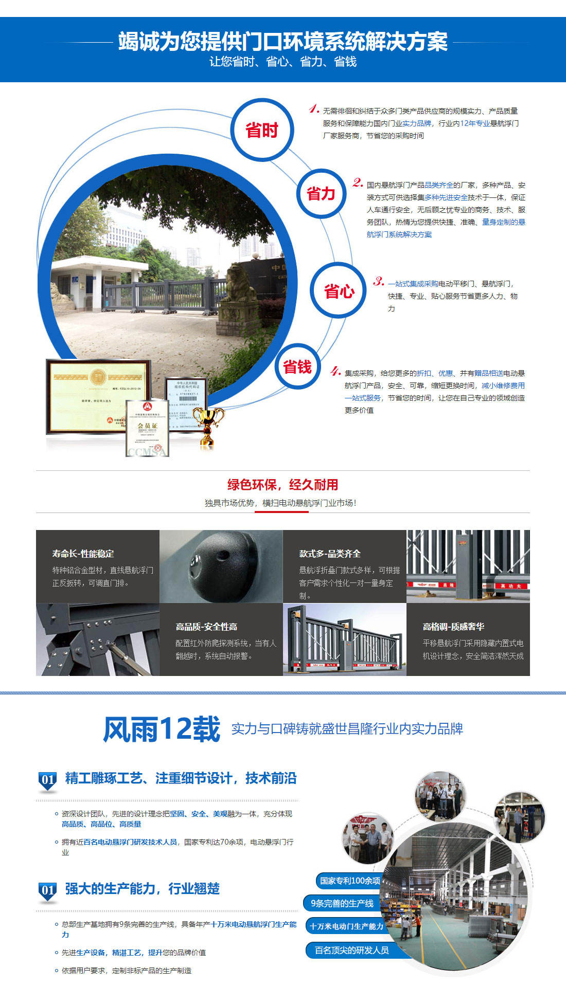 廣東盛世昌隆智能科技有限公司-電動(dòng)大門(mén)專(zhuān)業(yè)制造商,營(yíng)銷(xiāo)實(shí)力企業(yè),外銷(xiāo)品牌之一;產(chǎn)業(yè)涵蓋:服務(wù)于公共場(chǎng)所的智能懸航門(mén),電動(dòng)伸縮門(mén),懸航折疊門(mén),直線(xiàn)平移門(mén),懸掛門(mén)等智能電動(dòng)大門(mén)10大系列的高科技產(chǎn)品,擁有近70余項(xiàng)國(guó)家專(zhuān)利。成功通過(guò)并導(dǎo)入ISO9001-2016質(zhì)量管理系統(tǒng),國(guó)家質(zhì)量監(jiān)督局認(rèn)證。