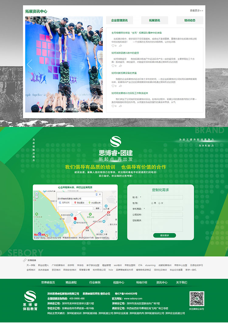 深圳思博睿拓展培訓有限公司專注于團隊成長及團隊建設的研究與服務,借助于體驗式培訓的學習方式,協助企業及組織增強團隊凝聚力,提高組織效能,提升團隊生產力!作為行業領先的培訓服務機構,我們以客戶需求為導向,以客戶價值為中心,建立了全面完善的《經典拓展》、《軍事特訓》、《創意團建》、《主題策劃》、《青少年探索教育》五大課程體系,以滿足客戶全方位、立體化的培訓訴求。